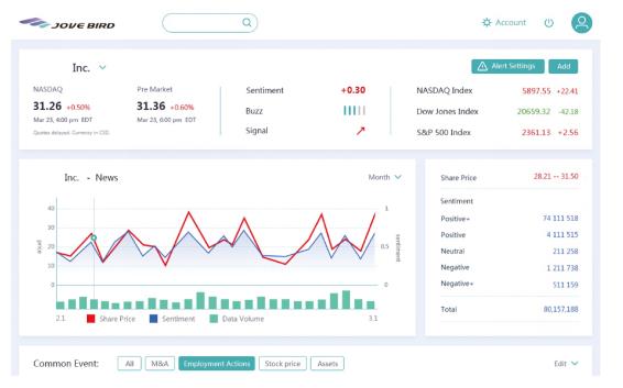 于洋在會(huì)上展示了中譯語(yǔ)通的最新金融大數(shù)據(jù)產(chǎn)品JoveBird(卓英),它是以金融分析模型和強(qiáng)大的跨語(yǔ)言大數(shù)據(jù)處理能力為基礎(chǔ)的智能金融投資分析引擎,為投資者提供最新的投資機(jī)會(huì)分析,并幫助投資者從全球角度制定最佳投資策略。JoveBird指數(shù)融合了20多項(xiàng)因子,包括傳統(tǒng)金融參數(shù)和可替代數(shù)據(jù)指標(biāo),這些數(shù)據(jù)呈現(xiàn)能夠幫助投資者了解市場(chǎng)上的真實(shí)事件,并將其作為現(xiàn)有評(píng)估模型的輸入數(shù)據(jù),消除信息不對(duì)稱風(fēng)險(xiǎn),預(yù)測(cè)上市公司股價(jià)趨勢(shì),有效實(shí)現(xiàn)超額回報(bào)。