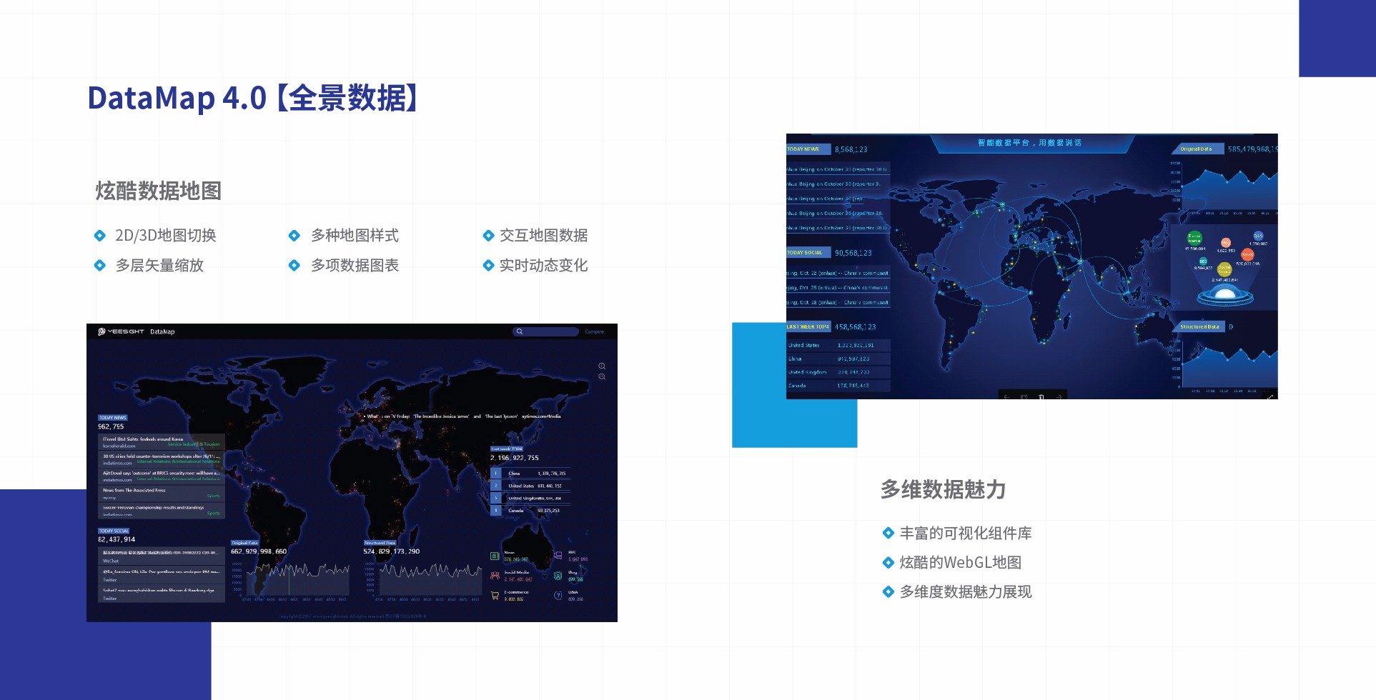 DataMap4.0是中譯語通(GTCOM)自主研發(fā)的一款強(qiáng)大的數(shù)據(jù)可視化開發(fā)工具。它不僅可以定制化分析客戶自有數(shù)據(jù),更可依托中譯語通自有的知識圖譜、自然語言算法、恐慌預(yù)測分析等智能算法,實(shí)現(xiàn)對各種數(shù)據(jù)的深度可視化挖掘分析;還能夠提供便捷、所見即所得的數(shù)據(jù)可視化配置工具,滿足不同行業(yè)客戶在事件監(jiān)測、業(yè)務(wù)管控、風(fēng)險(xiǎn)預(yù)警、地理信息分析等多領(lǐng)域業(yè)務(wù)的可視化需求。
